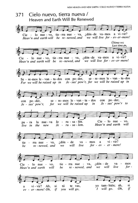 First Line: Cielo nuevo, tierra nueva ¿dónde vamos a vivir? (Heav'n and earth will be renewed and we will live forevermore!)