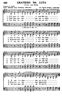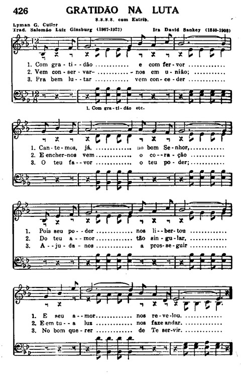 Display Title: Gratidão Na LutaFirst Line: Com gratidão e com fervorTune Title: [Com gratidão e com fervor]Author: Lyman G. Cutler; Salomão Luiz Ginsburg (1867-1927)Date: 1971