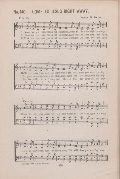 Display Title: Come to Jesus right away First Line: Come to Jesus, youthful pilgrims Author: Frank M. Davis Date: 1897