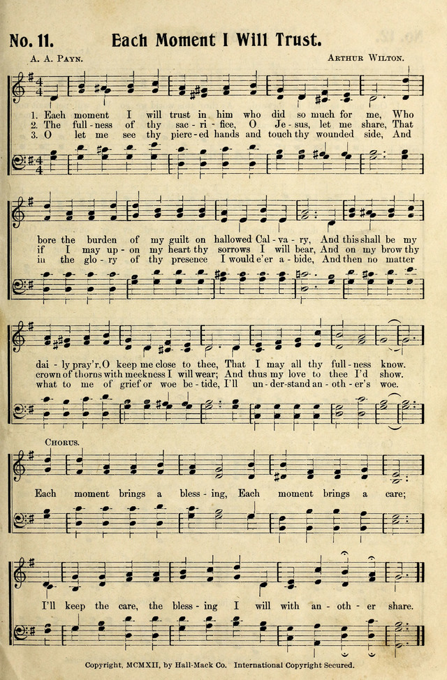 Display Title: Each Moment I Will Trust First Line: Each moment I will trust in him who did so much for me Tune Title: [Each moment I will trust in him who did so much for me] Author: A. A. Payn Date: 1912