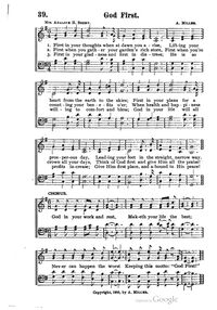 Display Title: God FirstFirst Line: First in your thoughts when at dawn you ariseTune Title: [First in your thoughts when at dawn you arise]Author: Mrs. Adaline H. BeeryDate: 1905