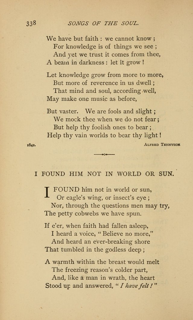Tennyson, Alfred, Lord, son of the Rev. G. C. Tennyson, Rector of Somersby, Lincolnshire, was born at Somersby, Aug. 6, 1809; educated at Trinity College, Cambridge; appointed Poet Laureate in 1850, and raised to the Peerage in 1884. Although Lord Tennyson has not written any hymns, extracts from his poems are sometimes used as such, as "Strong Son of God, immortal Love" (Faith in the Son of God), from the Introduction to his In Memoriam, 1850; the well-known "Too late, too late, ye cannot enter now," and others. The former is sometimes given as "Spirit of immortal Love," and again as "Eternal God, immortal Love."