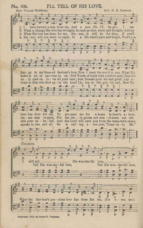 Display Title: I'll Tell of His LoveFirst Line: I have turned away from sinTune Title: [I have turned away from sin]Author: Miss Willie WoffordDate: 1913