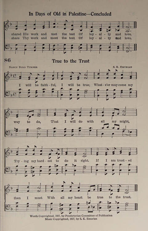 Display Title: True to the TrustFirst Line: I will be faithful, I will be trueTune Title: [I will be faithful, I will be true]Author: Nancy Byrd TurnerDate: 1927