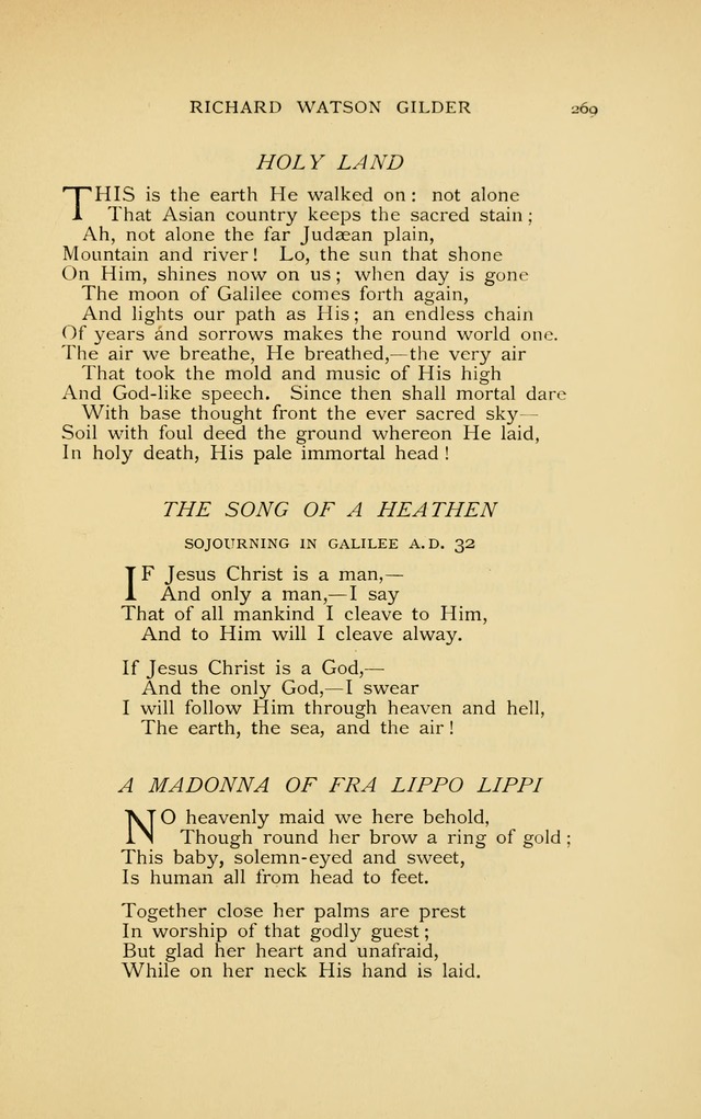 Gilder, Richard Watson, LL.D., was born at Bordentown, N.J., Feb. 8, 1844, and educated at a Seminary at Flushing, L.I. He was associate-editor of Scribner's Monthly (now The Century) from its commencement in 1870 to 1881, when, on the death of J. G. Holland, he became editor-in-chief. His poetical works are somewhat numerous, and include The New Day, 1875; Lyrics, 1885; Two Worlds, 1801; Poems and Inscriptions, 1901; and In the Heights, 1905. His hymns in common use are:—