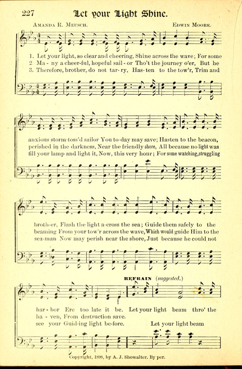 Display Title: Let Your Light ShineFirst Line: Let your light, so clear and cheeringTune Title: [Let your light, so clear and cheering]Author: Amanda R. MeuschDate: 1900