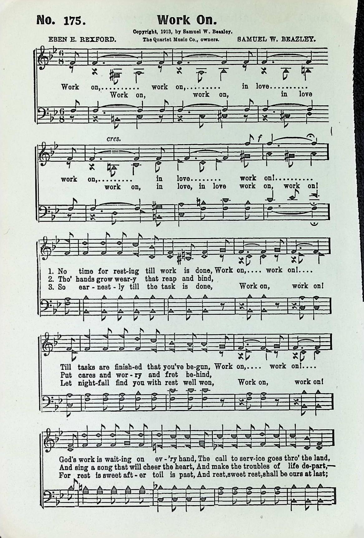 Display Title: Work OnFirst Line: No time for resting till work is doneTune Title: [No time for resting till work is done]Author: Eben E. RexfordDate: 1914