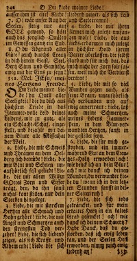 O du Liebe meiner Liebe. [Passiontide.] Included in the Geistreiches Gesang-Buch, Halle, 1697, p. 203, in 7 stanzas of 8 lines, and in Wagner's Gesang-Buch, Leipzig, 1697, vol. ii. p. 870. Repeated in Freylinghausen's Gesang-Buch, 1704, and recently in the Berlin Geistliche Lieder, edition 1863.
