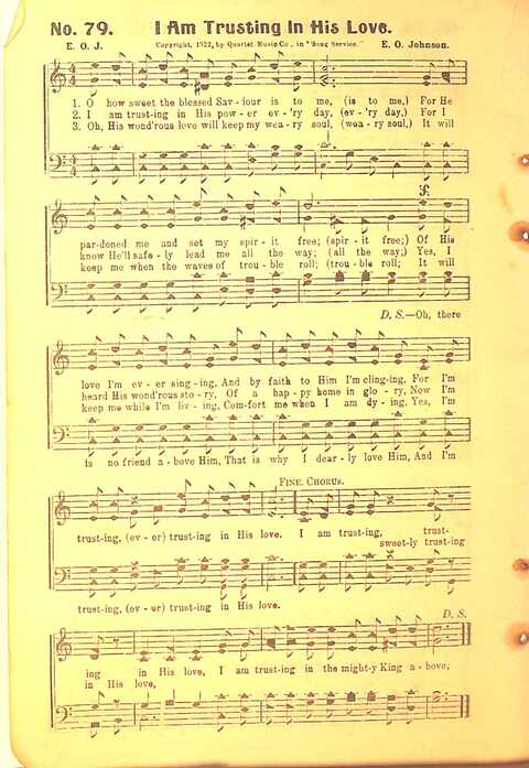 Display Title: I Am Trusting in His LoveFirst Line: O how sweet the blessed Saviour is to meTune Title: [O how sweet the blessed Saviour is to me]Author: E. O. J.Date: 1922
