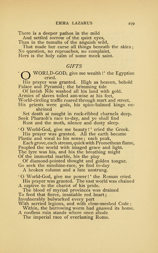 Display Title: Gifts First Line: O World-God, give me wealth! the Egyptian cried Author: Emma Lazarus Date: 1896