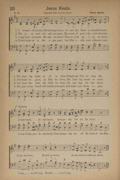Display Title: Jesus heals, Jesus heals, sympathy for all He feels First Line: O wounded hearts, this message hear Author: Thoro Harris Date: 1917