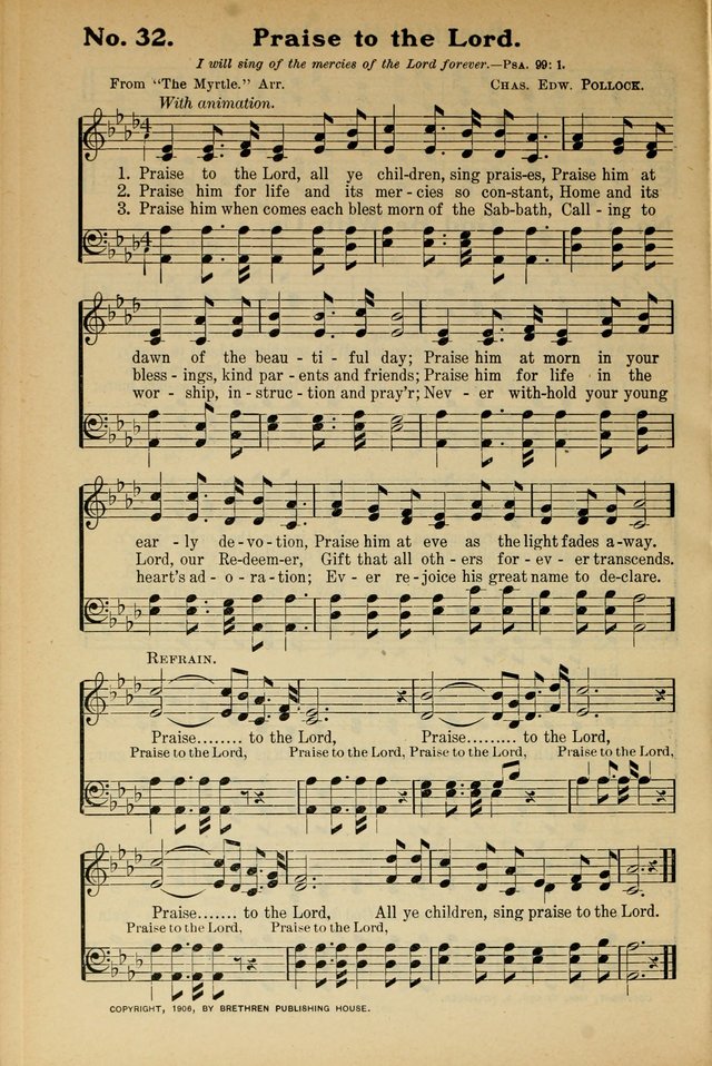 Display Title: Praise to the LordFirst Line: Praise to the Lord, all ye children, sing praisesTune Title: [Praise to the Lord, all ye children, sing praises]Date: 1906Source: Words from "The Myrtle," arr.