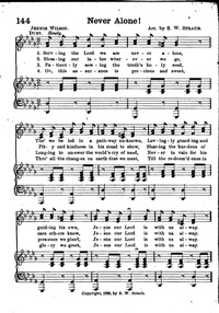 Display Title: Never Alone!First Line: Serving the Lord we are never aloneTune Title: [Serving the Lord we are never alone]Author: Jennie WilsonDate: 1893