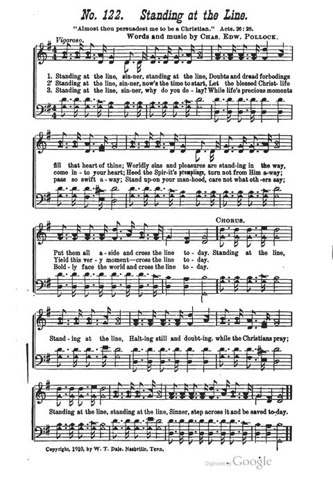 Display Title: Standing at the Line First Line: Standing at the line, sinner, standing at the line Tune Title: [Standing at the line, sinner, standing at the line] Author: Chas. Edw. Pollock Date: 1911