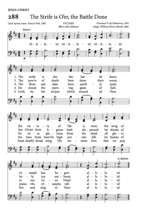 These anonymous words first appeared in the Jesuit collection, Symphonia Sirenum Selectarum in 1695. They were translated by Francis Pott in 1859, and published in five stanzas. These stanzas appear in most modern hymnals, though some, such as the Presbyterian Hymnal and the United Methodist Hymnal, leave out the fourth verse, which begins, “He closed the yawning gates of hell,” or, “He broke the age-bound chains of hell.” Other phrases or words are slightly varied between hymnals; the first verse in the Psalter Hymnal reads, “the victory of life is won,” whereas that same line in Worship and Rejoice is, “now is the victor’s triumph won.” These are all simply matters of prose, and don’t alter the meaning of the text in a significant way.