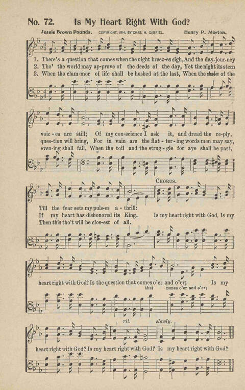 Display Title: Is my heart right with God First Line: There's a question that comes when the night Author: Jessie H. Brown Pounds Date: 1920