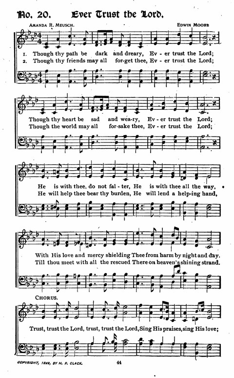Display Title: Ever Trust the LordFirst Line: Though thy path be dark and drearyTune Title: [Though thy path be dark and dreary]Author: Amanda R. MeuschDate: 1899