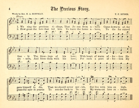 Display Title: The Precious StoryFirst Line: We sing the precious tidingsTune Title: [We sing the precious tidings]Author: Rev. E. A. HoffmanDate: 1884