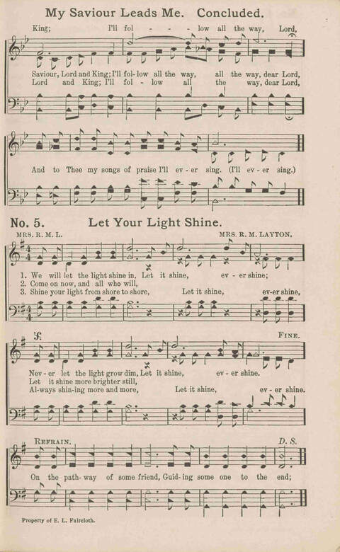 Display Title: Let Your Light ShineFirst Line: We will let the light shine inTune Title: [We will let the light shine in]Author: Mrs. R. M. L.Date: 1912