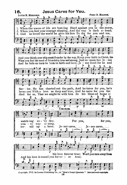 Display Title: Jesus Cares for YouFirst Line: When the waves of life are beatingTune Title: [When the waves of life are beating]Author: Louis E. HolcombDate: 1913