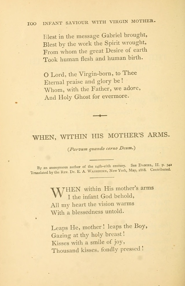 Washburn, Edward Abiel, D.D., was born April 16, 1819; graduated at Harvard, 1838; studied theology at Andover and New Haven, and entered the Congregational ministry. In 1844, having been ordained in the Protestant Episcopal Church, he became Rector of St. Paul's, Newburyport, Mass., where he remained till 1851. Spending 1851-52 in Europe, on his return he became Rector of St. John's, Hartford, 1853-62, and Professor of Church Polity in Berkeley Divinity School, Middletown, Connecticut; also Rector of St. Mark's, Philadelphia, 1862-65; and Calvary, New York, 1865-81. He died Feb. 2, 1881. His works include Social Law of God, 1874, and translations of Latin hymns. A selection from his poems was published in New York in 1881. Some of his t…