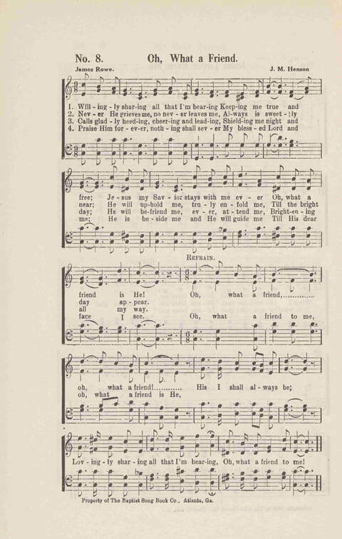 Display Title: Oh, What a FriendFirst Line: Willingly sharing all that I'm bearingTune Title: [Willingly sharing all that I'm bearing]Author: James RoweDate: 1920