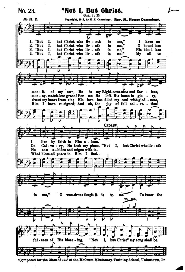M. Homer Cummings was born near Pickaway, August 23, 1890, and was graduated from Trevecca College, Nashville, Tennessee, in 1909. After spending a year in the University of Chattanooga, he entered the ministry of the Methodist Episcopal Church in 1911. Since then he has written more than sixty hymns, the more popular being these: "My Lord and King," "There is a Gladness," "What Will You Do with Jesus?" "Come Where the Blessings Fall," The Gospel According to You," "Jesus Is the One You Need." Others appear in "Echoes from Beulah," published by the author at Ripley, W. Va. Mr. Cummings has also written "You Are My Sweetheart," a secular song that has been well received by the music public. His parents are H. M. Cummings and wife, Pickaway.…