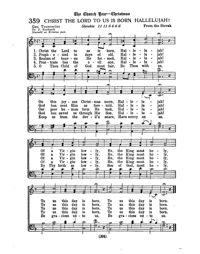 Tune Title: SLOVAKIAFirst Line: Christ the Lord to us is born, Hallelujah!Meter: 11 11 6 6 6 6Key: F MajorDate: 1930Source: Chorale: Narodil se Kristus pan; From the Slovak