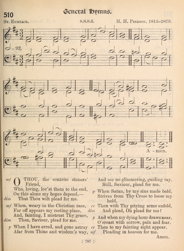 Tune Title: ST. EUSTACEFirst Line: O Thou, the contrite sinners' FriendComposer: H. H. Pierson, 1815-1873Meter: 8.8.8.6.Incipit: 77771 25432 11176Date: 1903