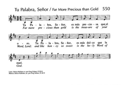 Tune Title: [Tu Palabra, Señor, es más preciosa que el oro] First Line: Tu Palabra, Señor, es más preciosa que el oro Composer: Delcio Källsten Key: D Major Date: 2010 Source: Argentina