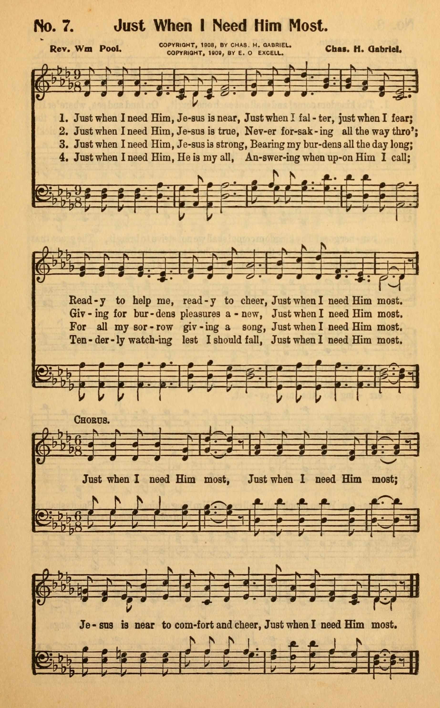 [Just when I need Him, Jesus is near]