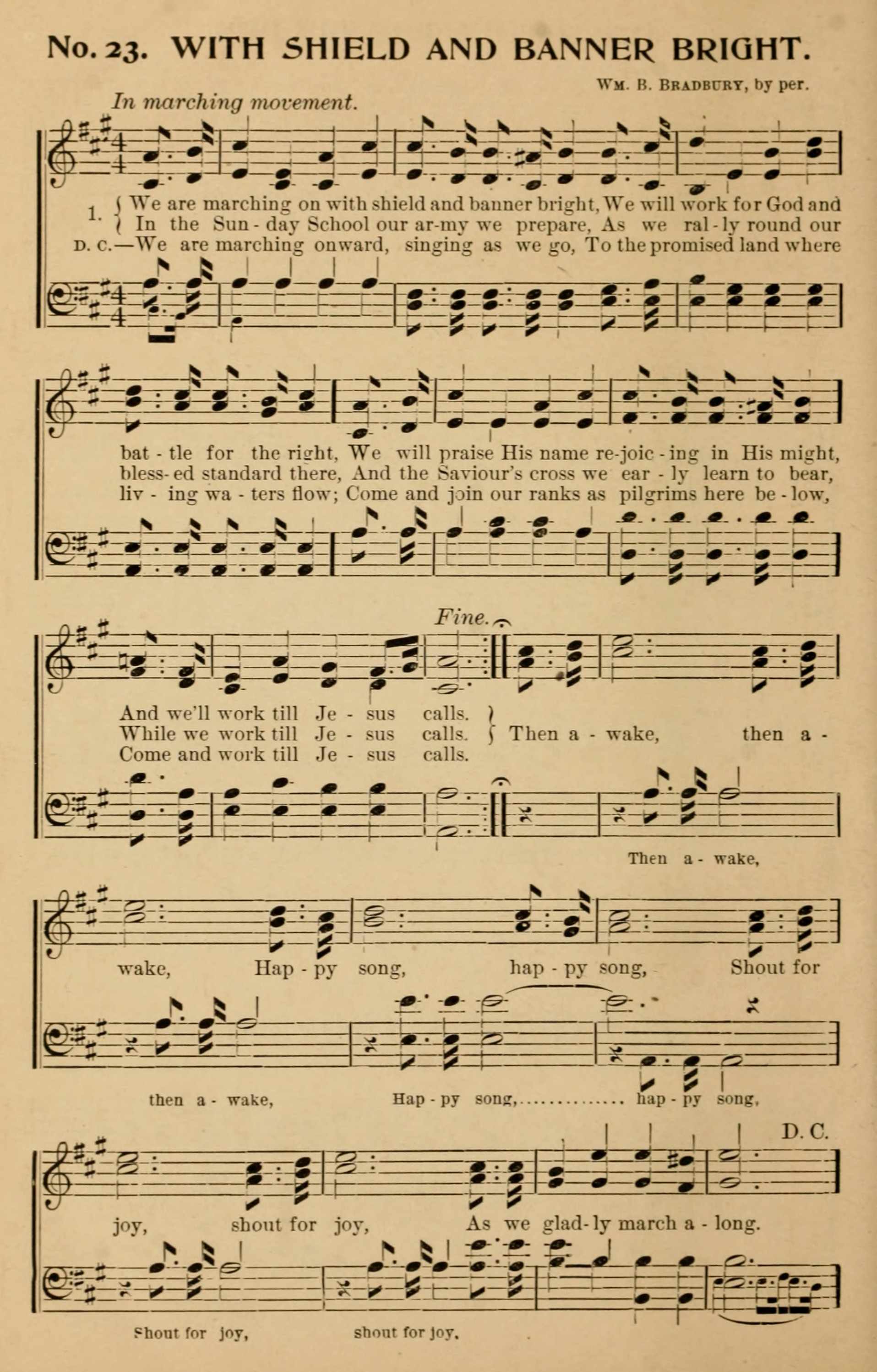 [We are marching on with shield and banner bright]