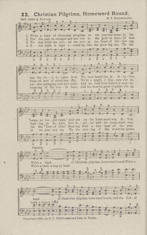 | Refrain First Line: | We're a band of Christian pilgrims, homeward bound |