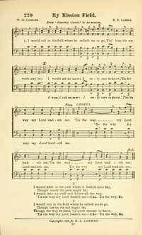 Author: W. O. CushingHymnal: The Standard Church Hymnal #311 (1888)First Line: I would toil in the field where he calleth me to goLanguages: EnglishTune Title: MY MISSION FIELD
