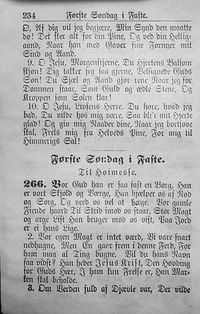 Author: Brorson Hymnal: M. B. Landstads Kirkesalmebog og "Nokre Salmar" ved Professor Dr. E. Blix, samt følgende tillæg #151 (1897) Topics: Twenty-first Sunday after Trinity Sunday For Evening Lyrics: 1 Hvordan takke vi vor Herre, For han gav sin Søn herned? Mange skjønne lidt, desværre, Paa saa stor en Kjærlighed; Deres onde Syndelyst Dække de med Naadens Trøst, Vil af Jesu intet lære, Og dog sande Kristne være. 2 Vistnok ingen Sjæl fordømmes, Naar man paa sin Jesum tror, Naadens Kilde aldrig tømmes, Naaden er og bliver stor; Men det er en afsagt Dom, Siden Jesus til os kom, Skal man sig fra Synden vende, Eller ogsaa evig brænde. 3 At du vil i dine Lyster Fare fort, som du er van, Og dig dog ved Jesum trøster, Gaar i Evighed ei an. Kjære Hjerte, Et af To: Enten udi Bøn og Tro Syndens Vei at fly og hade, Eller lide Sjæleskade. 4 Lyset er i Verden kommet; Veed du ogsaa om du tror? Har du nogen Tid fornummet, At din Jesus i dig bor? Har hans Naade-Straalers Kraft I din Sjæl sin Virkning havt? Kan du i dit Hjerte finde, At der er et Lys derinde? 5 Hvordan gaar man dog og drømmer Udi saadan vigtig Sag, Og i Sikkerhed forsømmer Naadens dyrbare Dag! Det er Tid at sanse vel, Og at sorge for din Sjæl; Det et Tid at forkomme Herrens store Vredes Domme. 6 Gud, som Lyset lod opklare Udi Naadens blide Aar, Vil og ingenlunde spare Den, som dette Lys forsmaar. Vil du vende Ryggen til, Gud dig fra sig støde vil; Den, som ei vil Lyset kjende, Han skal sig paa Lyset brænde. 7 Lad din Naades Glans oprinde, Søde Jesu, at jeg maa Derved altid Veien finde, Som jeg bør at vandre paa! Vær min Formand, at jeg ei Kommer paa den brede Vei, Eller fra dit Fodspor viger, Til jeg ind i Himlen stiger! Languages: Norwegian