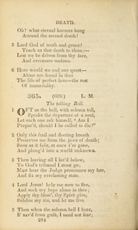 Hymnal: A Collection of Hymns and Prayers, for Public and Private Worship #365 (1845) Meter: 8.8.8.8 Topics: Consummation of Things Death First Line: Oft as the bell, with solemn toll Lyrics: 1 Oft as the bell, with solemn toll,
