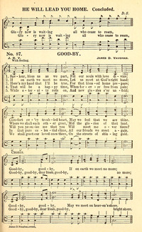 Author: James RoweHymnal: Singing Star #55 (1941)First Line: Saviour, bless us as we partRefrain First Line: Goodby, goodbyLanguages: EnglishTune Title: [Saviour, bless us as we part]
