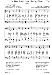 Author: A. Reusner, 1496-c. 1575; C. Winkworth, 1827-78 Hymnal: Evangelical Lutheran Hymnary #524 (1996) Meter: 8.8.7.4.4.7 Topics: Citizenship Lyrics: 1 In Thee, Lord, have I put my trust;