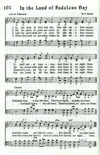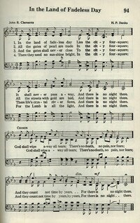 Author: John R. ClementsHymnal: Great Songs of the Church #151 (1926)First Line: In the land of fadeless dayLanguages: EnglishTune Title: [In the land of fadeless day]