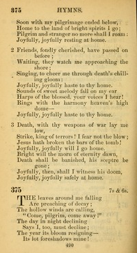 Hymnal: The Book of Worship #375 (1867) Topics: Man a Saint In Prospect of Heaven Lyrics: 1 The leaves around me falling Are preaching of decay; The hollow winds are calling, "Come, pilgrim, come away!" The day in night declining Says I, too, must decline; The year its bloom resigning-- Its lot foreshadows mine! 2 The light my path surrounding, The loves to which I cling, The hopes within me bounding, The joys that round me wing-- All, all, like stars at even, Just gleam and shoot away, Pass on before to heaven, And chide at my delay. 3 The friends gone there before me, Are calling from on big, And happy angels o'er me Tempt sweetly to the sky; "Why wait," they say, "and wither, 'Mid scenes of death and sin? Oh rise to glory hither, And find true life begin!" 4 I hear the invitation, And fain would rise and come, A sinner to salvation, An exile to his home; And while I here must linger, Thus, thus, let all I see Point on with faithful finger To heaven, O Lord, and Thee! Languages: English