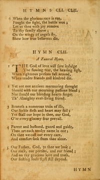 Hymnal: CPHP1789 #CLII (1789) Lyrics: 1 The God of love will sure indulge The flowing tear, the heaving sigh, When righteous persons fall around, When tender friends and kindred die. 2 Yet not one anxious murmuring thought Should with our mourning passions blend; Nor should our bleeding hearts forget Th' Almighty ever-living friend. 3 Beneath a numerous train of ills, Our feeble flesh and heart may fail; Yet shall our hope in thee, our God, O'er every gloomy fear prevail. 4 Parent and husband, guard and guide, Thou art each tender name in one; On thee we cast our every care, And comfort seek from thee alone. 5 Our Father, God, to thee we look; Our rock, our portion, and our friend; And on thy gracious love and truth, Our sinking souls shall still depend. Topics: Funeral Hymn Languages: English