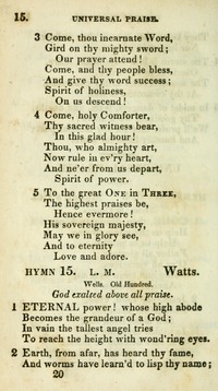 Author: Watts Hymnal: Village hymns for social worship, selected and original #15 (1840) Meter: 8.8.8.8 Topics: Universal Praise