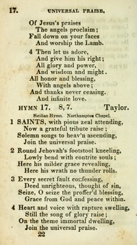 Author: Taylor Hymnal: Village hymns for social worship, selected and original #17 (1840) Meter: 8.7 Topics: Universal Praise