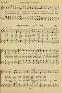 Author: S. F. Smith Hymnal: The Praise Book #221 (1906) Topics: Patriotic First Line: My country, ’tis of thee Tune Title: AMERICA