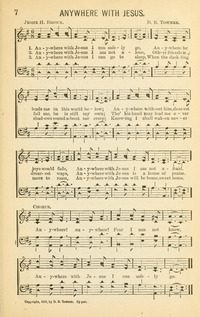 Author: Jessie Brown Pounds; Mrs. C. M. A.Hymnal: Church Gospel Songs and Hymns #6 (1983)First Line: Anywhere with Jesus I can safely goRefrain First Line: Anywhere, anywhere!Topics: YouthLanguages: EnglishTune Title: [Anywhere with Jesus I can safely go]