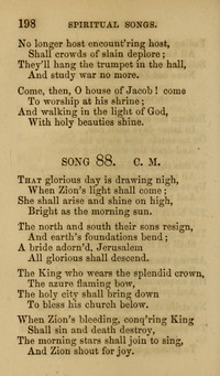 Hymnal: A Collection of Hymns and Spiritual Songs #V (1801) Lyrics: 1 The glorious day is drawing nigh, When Sion's light shall come: She shall arise and shine on high Bright as the morning sun. The north and south their suns resign, And earth's foundations bend; Adorn'd as a bride Jerusalem, All-glorious shall descend. 2 The king that bears the golden crown, The azure, flaming bow; The holy city shall bring down To bless his saints below. When Sion's bleeding conqu'ring king, Shall sin and death destroy; The morning stars together sing, And Sion shout for joy. 3 The holy, bright, musician bands Who sing on harps of gold, Palms in their hands they upward tend, Fair Salem to behold! Ascending on such melting strains, Jehovah's name they bear: Such shouts thro' earth's extensive plains, Was never heard before! 4 Let satan rage and boast no more, Ye fiends of darkness fly; Though saints are feeble, weak, and poor, Their great Redeemer's nigh. He is their shield— their hiding place— A covert from the wind— Streams from the rock in the wilderness, Throughout this weary land. 5 The chrystal streams run down from heav'n, They issue from the throne: The floods of strife away are driv'n, The church becomes but one. That peaceful union she shall know, And live upon his love! And shout and sing of grace below, As angels do above! Languages: English