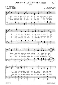 Author: K. J. P. Spitta, 1801-1859; R. Massie, 1800-87 Hymnal: Evangelical Lutheran Hymnary #531 (1996) Meter: 7.6.7.6.7.6.7.6 Topics: Trinity 24 Lyrics: 1 O blessed Sun whose splendor Dispels the shades of night; O Jesus, my Defender, My souls' supreme delight, Though fortune should bereave me Of all I love the best, If Thou Thy love still leave me, I freely give the rest. 2 I know no life divided, O Lord of life, from Thee; In Thee is life provided For all mankind and me; I know no death, O Jesus, Because I live in Thee; Thy death it is which frees us From death eternally. 3 Lord, with this truth impress me, And write it on my heart, To comfort, cheer, and bless me, That Thou my Savior art. Thy love it was which sought me, Thyself unsought by me, And for Thy ransom bought me To live for aye in Thee. Languages: English Tune Title: HEAVENLY LOVE