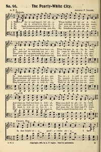 Author: A. F. I.Hymnal: The Gospel Message No. 3 #96 (1913)First Line: There's a holy and beautiful cityRefrain First Line: In that bright city, pearly white cityLanguages: EnglishTune Title: [There's a holy and beautiful city]