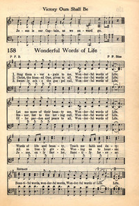 Author: P. P. B.Hymnal: The Sheet Music of Heaven (Spiritual Song) #143 (1926)First Line: Sing them over again to meRefrain First Line: Beautiful words, wonderful wordsLanguages: EnglishTune Title: [Sing them over again to me]