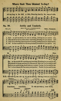 Author: W. L. T.Hymnal: Songs for All #99 (1906)First Line: Softly and tenderly Jesus is callingRefrain First Line: Come home, come homeTune Title: [Softly and tenderly Jesus is calling]